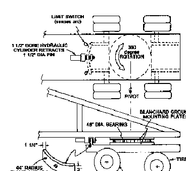 This large bearing was required to carry the bending loads induced by the offset castor wheel. Bearing mount steel plates (1.5 inch thick) were first welded to the tail structure and to the rear trailer structure. The plates were next blanchard ground flat prior to drilling and tapping with a magnetic base drill. Lastly, the bearing was bolted to the plates.