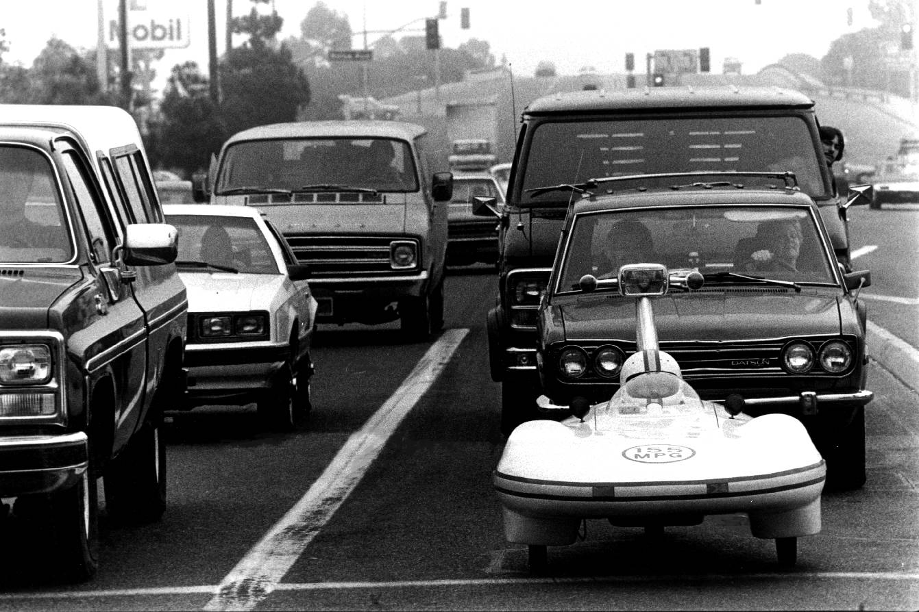 The California Commuter 157 MPG La to SF Guinness World Record holder California Commuter Photos This overhead photo shows the aerodynamic teardrop shape of the California Commuter. Linda Isle, Newport Beach, California. Stabilizing fin and "visibility pod" dominate this rear quarter view. Yes, it is SMALL and light!
