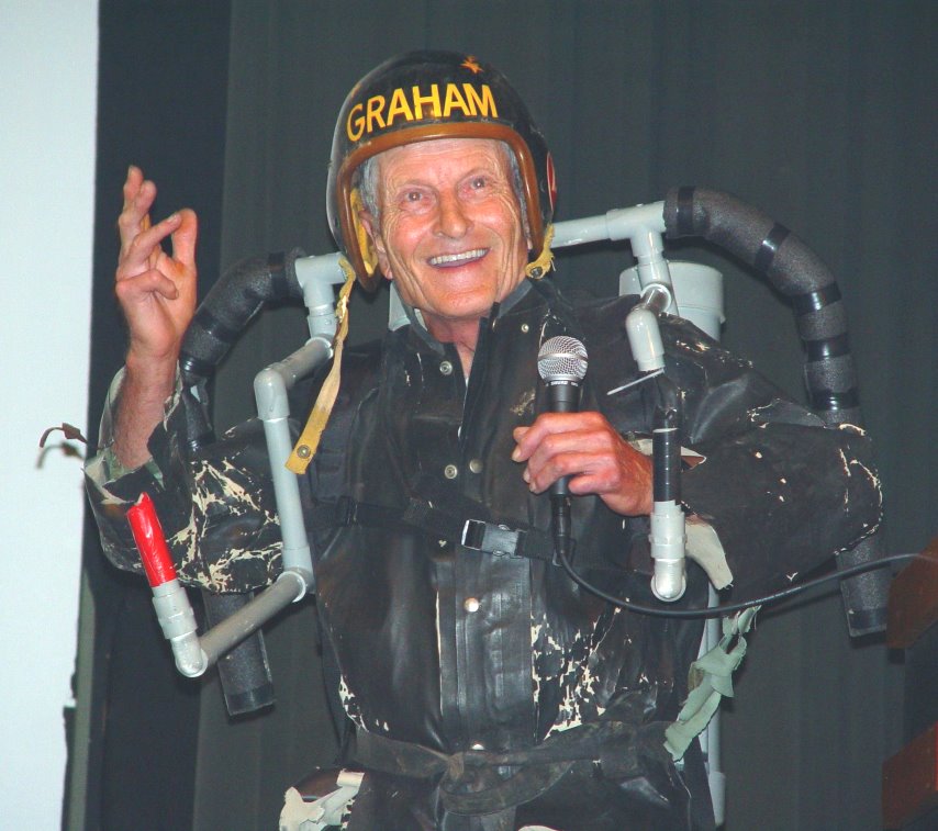 ![]() The world's first Rocket Belt pilot, Harold Graham, had more fun than anybody at the conference! He was fabulous! Harold wore his original rubber suit and helmet with a PVC rocket belt mockup for his grand entrance and skit. (Photo by Ky) |